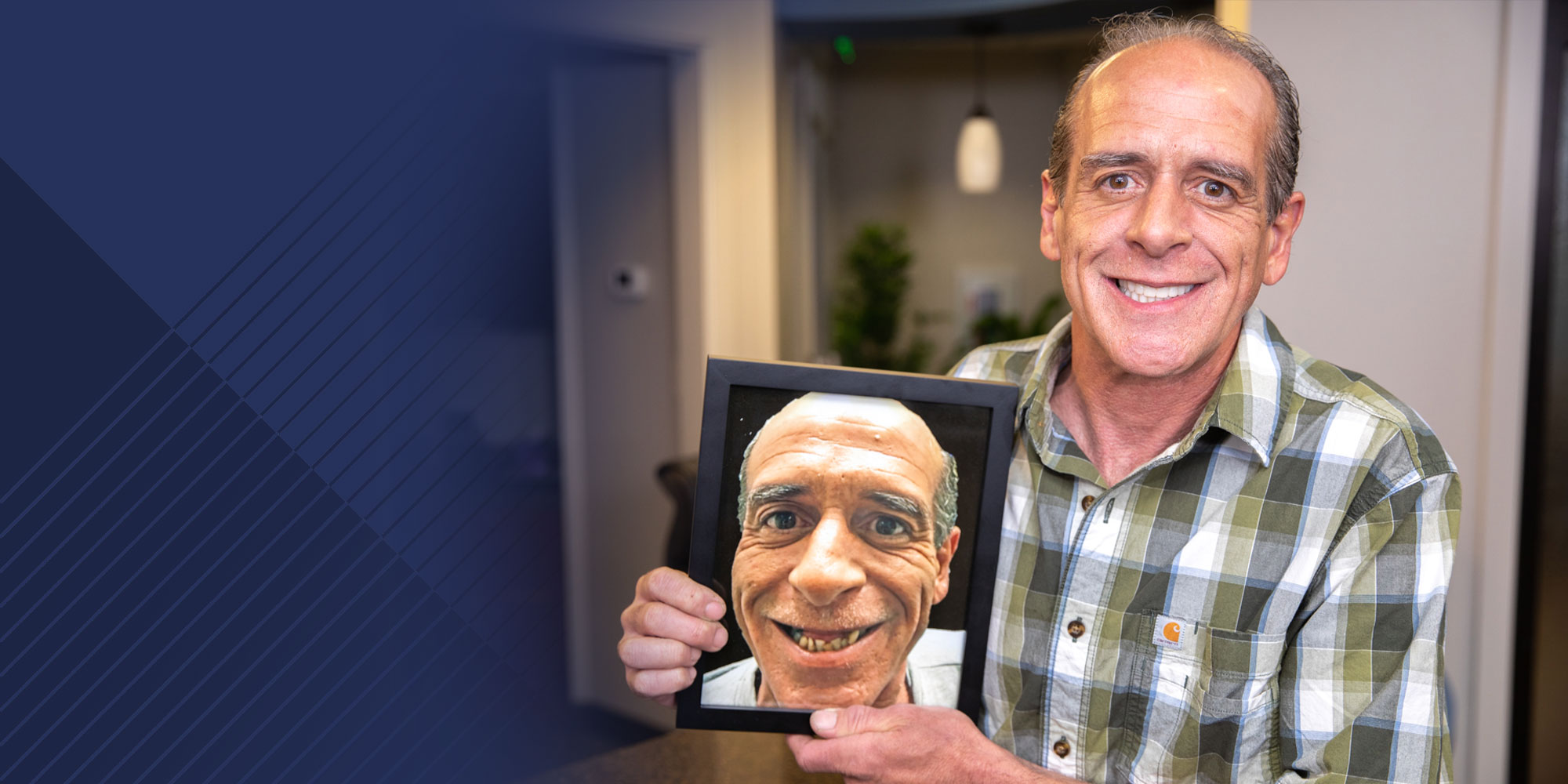 dental implant patient smiling and holding up photo of himself prior to treatment
